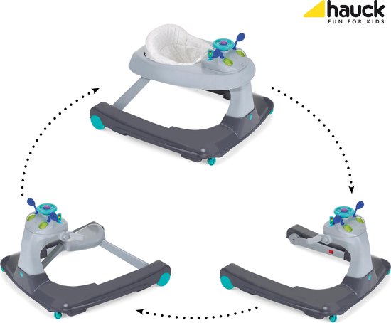 Met de Hauck Ride On 1-2-3 kan je kind vanaf 6 maanden, als deze zelfstandig goed kan zitten, beginnen met zijn avontuur in deze loopstoel. De Hauck loopstoel kan je na enige tijd gebruiken als loopkar, zodat je kleintje lopend de wereld gaat verkennen. Uiteindelijk scheurt je dreumes door het huis met de loopwagen. De 'cockpit' van de Ride On 1-2-3 lijkt op de binnenkant van de auto van papa of van mama. Er is een stuurwiel, twee spiegels, grote groene indicatoren en natuurlijk een hoorn. De kleurrijke knoppen op het speelelement moedigt je kindje aan om alles uit te proberen. Als je erop drukt, activeert je de 'radio' die verschillende kinderliedjes speelt. Om de ouders te niet helemaal gek te maken, kan de muziekmodule eenvoudig worden verwijderd.
